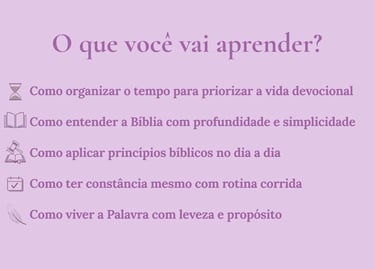 Mesmo que você nunca tenha conseguido manter uma rotina devocional, este curso vai te ajudar a encontrar tempo, propósito e intimidade com Deus por meio da Sua Palavra.